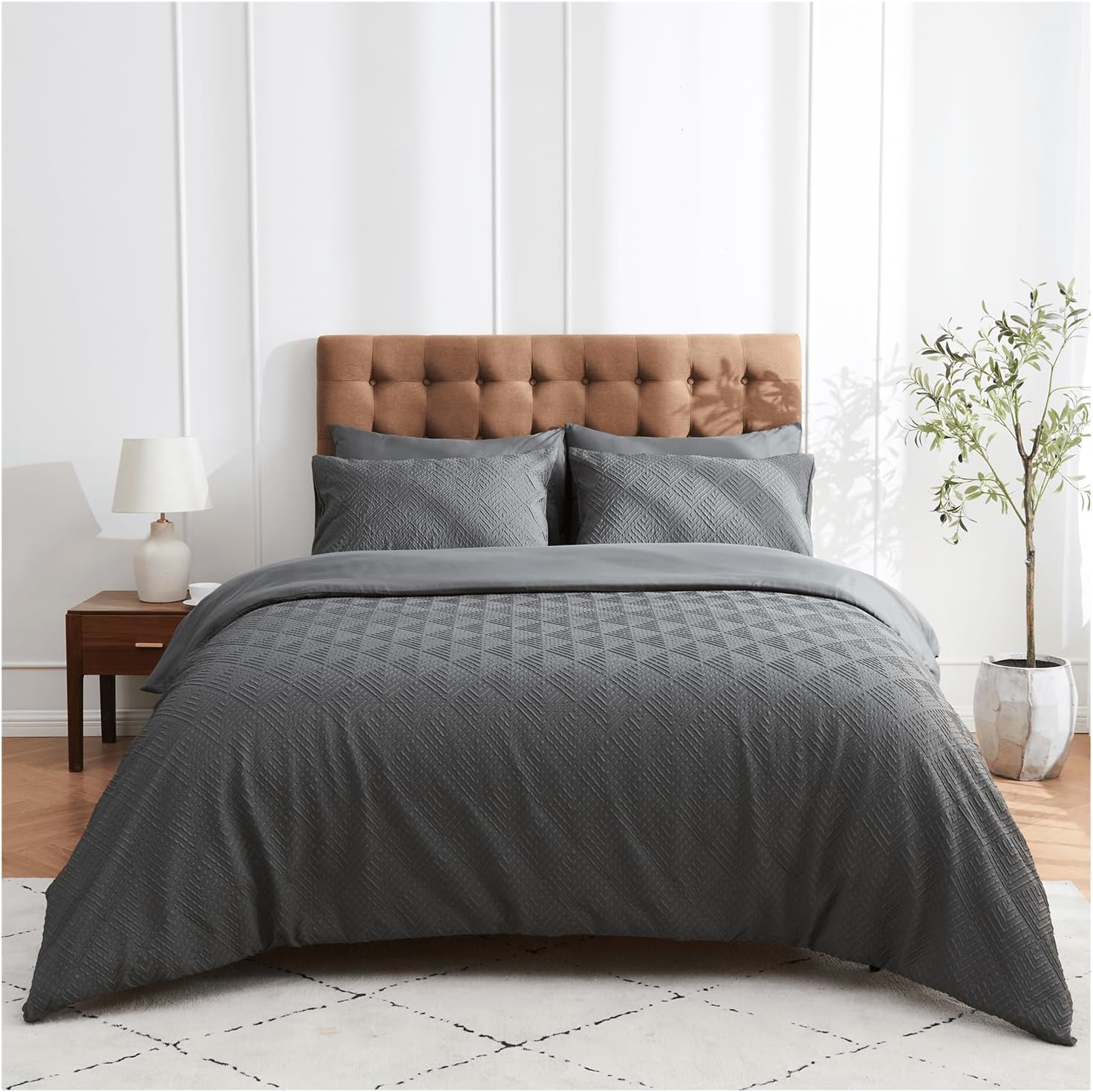 Elevate your bedroom décor with the modern elegance of the 3D Embossed Duvet Set – Truro Triangle. Featuring a striking geometric triangle pattern in a raised, textured 3D design, this duvet set adds depth and sophistication to any space. Crafted from soft, breathable fabric, it ensures a comfortable night's sleep while making a bold style statement. The embossed detailing enhances the visual appeal, creating a luxurious look that's both contemporary and timeless. The set includes matching pillowcases for a complete, polished finish. Perfect for those who appreciate both comfort and chic, minimalist design.